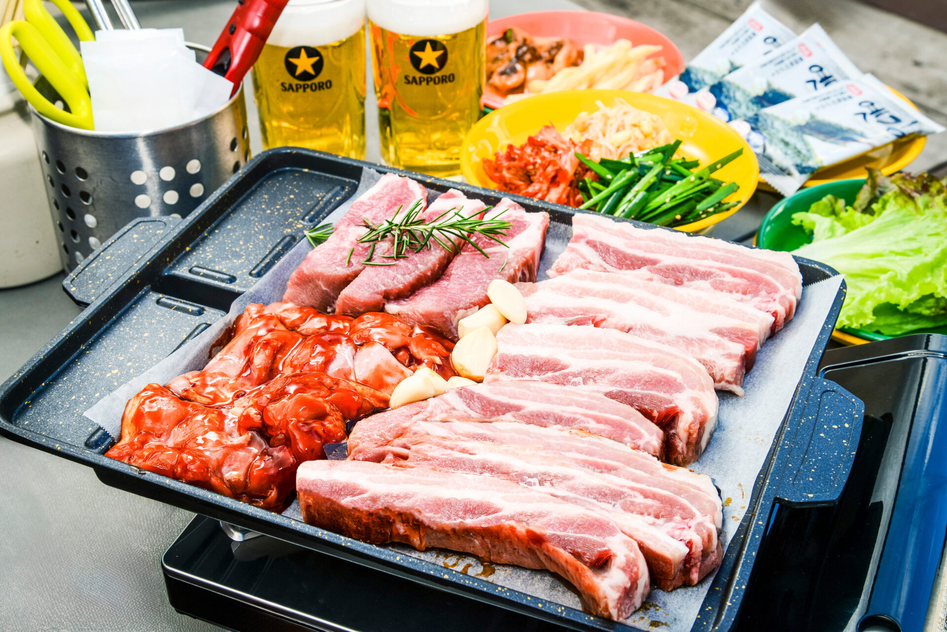 サムギョプサル(豚バラ)、モクサル(豚肩ロース)、ヤンニョムチキン風(鶏モモ)、キムチ、にんにく、サンチュ、辛味噌だれ※変更の場合あり
